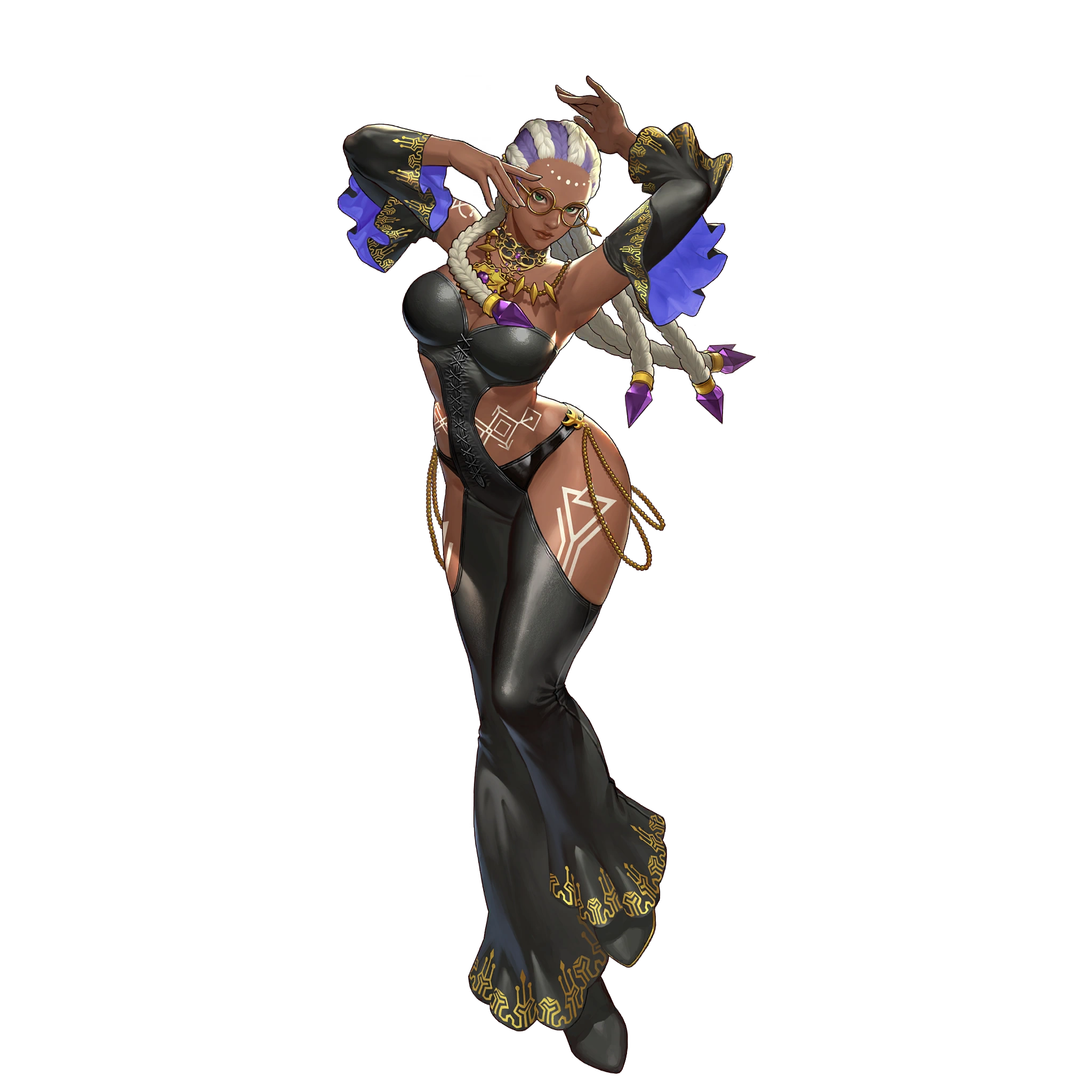 Dolores is a dark-skinned woman with an appearance that mixes both her prepossessing and conspicuous features. She's tall attributed with her heels, has green eyes and wears gold-colored glasses. Dolores hair is in a braided style with white and purple locs, on the end of her locs she has violet jewelry. Her attire is a cutout black jumpsuit that divides around her revealing midriff connecting at the waist; she has a matching black thong and arm sleeves. Her bewitching tattoos are geometric in shape, and she has them on her thighs, shoulders, back and stomach, lastly she wears her bedazzling gold necklace that's parted with a purple jewel in the center.