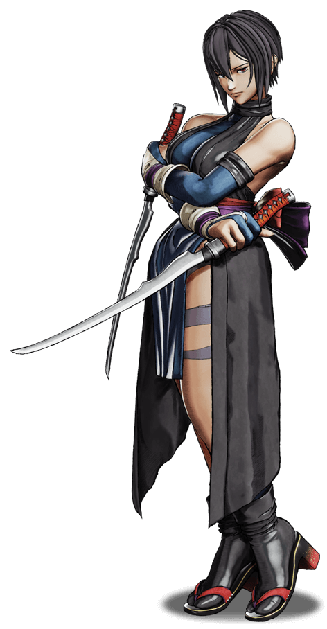She is a woman who was tailored to be Yuga's servant before her birth. Her identity and memory become fractured when she was brainwashed by Yuga in her adulthood. He engraves an enchanted snake tattoo on her back as a means to control her. She is told to find a man fit to become the perfect body for the Dark Lord's resurrection. Finding Haohmaru to be that man, she follows him for a chance to take him away to her master.[2] Her soul becomes freed after Haohmaru defeats Yuga.